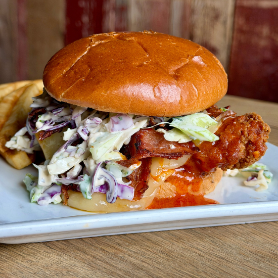 Crunchy fried chicken, pepper jack, smoked bacon, crunchy-creamy red onion-blue cheese-celery slaw, and a drizzle of buffalo sauce on a buttery brioche bun