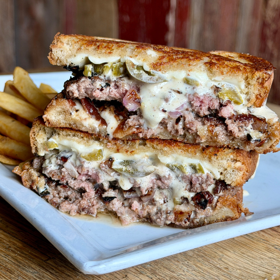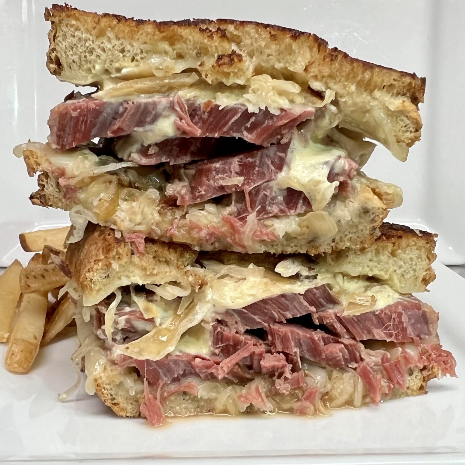 Hand-carved slabs of corned beef brisket, Swiss cheese, caramelized onion bacon kraut, and a horseradish Dijon aioli all grilled between thick-cut slices of New York rye bread