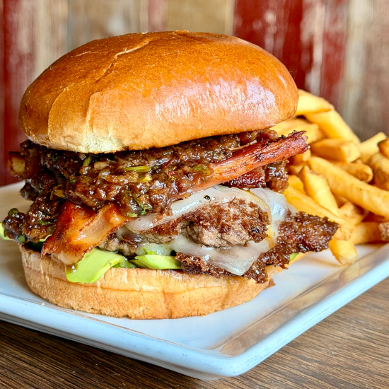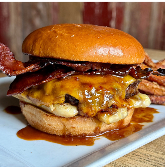Fresh ground, hand packed Angus beef topped with crispy smoked bacon, melting cheddar, grilled bananas, and spicy Thai peanut sauce. TCB!