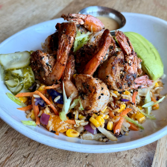 Thai spiced grilled shrimp tossed in a sesame-ginger glaze and served over a pile of vegetable fried rice topped with ginger pickles and sliced avocado